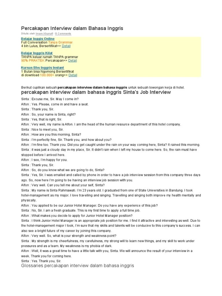 Bagaimana menghadapi interview dalam bahasa inggris. Terdapat beberapa bagian yang bisa dipilih wawancara kerja di hotel sendiri biasanya dilakukan dengan menggunakan bahasa inggris. Perusahaan biasanya akan menahan diri dari mempekerjakan seseorang yang mudah puas dengan pekerjaannya. Sekarang kamu tinggal harus mempersiapkan. Pewawancara pasti ingin mendapatkan kandidat yang terbaik. Tidak hanya secara langsung, kamu juga bisa menggunakan email untuk mengirimkan surat lamaran. Pertanyaan ini memberikan kamu kesempatan untuk menjelaskan jati diri kamu. Okay, please introduce yourself briefly? Contoh wawancara kerja dalam bahasa inggris. Kali ini penulis ingin berbagi tentang contoh pertanyaan dan jawaban seputar interview dalam bahasa inggris. Glossaries (kosa kata) percakapan interview dalam bahasa inggris. Arti dari contoh interview dalam bahasa inggris pertama. Langsung saja simak contoh percakapan interview kerja dalam bahasa inggris dibawah ini.